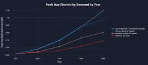 Exemple de résultat d’une comparaison multi-scénarios : prévision de la demande de pointe d’électricité (2021-2050) selon quatre pistes de transition pour le chauffage.